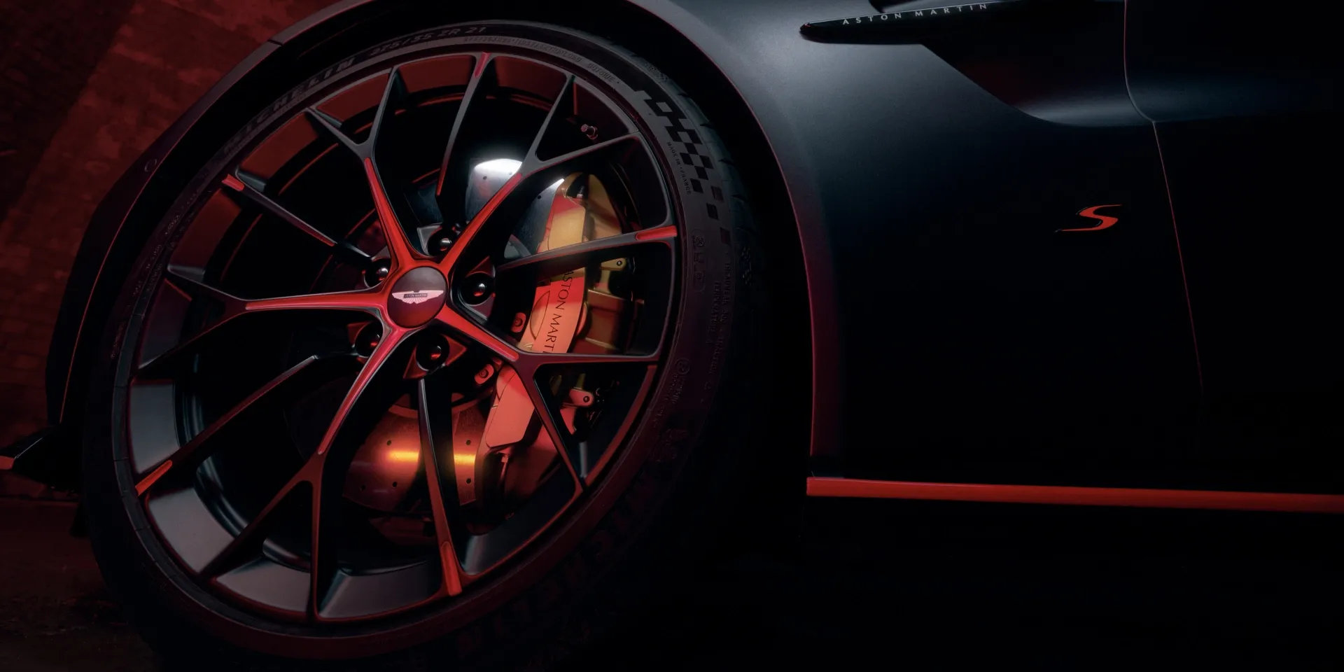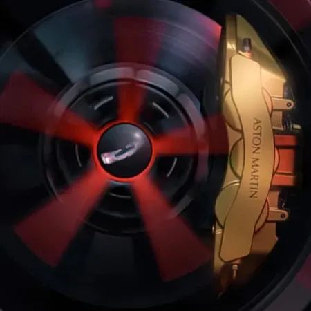 Available with Carbon Ceramic Brakes (CCBs), a further 60 lb of unsprung mass can be reduced. Vantage S brake discs are 16 in. at the front, 14 in. at the rear. Grooved and drilled for superior thermal management. Increasing braking efficiency and reducing brake fade at temperatures nearing 1,472 degrees Fahrenheit. Boosting driver confidence for later braking. Empowering the driver to push the limits further. Painted brake calipers, fitted in Black, Red, or Aston Martin Green as standard, offer a striking accent of color and an evocative signal of performance.